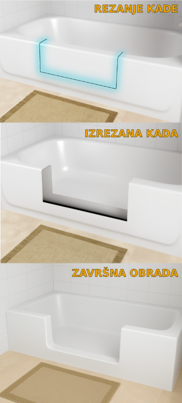 Rezanje kade je precizna i brza intervencija na postojećoj kadi. Prvo se s korisnikom dogovara gdje će biti otvor, a zatim se na tom mjestu označi i pažljivo izreže dio kade (i pločica ako je potrebno). Slijedi zidanje ili popunjavanje izrezanog dijela kako bi ulaz bio čvrst i siguran. Na kraju se sve dodatno obrađuje, a po želji može se obojiti u nijansu koja se najbolje uklapa u kupaonicu.